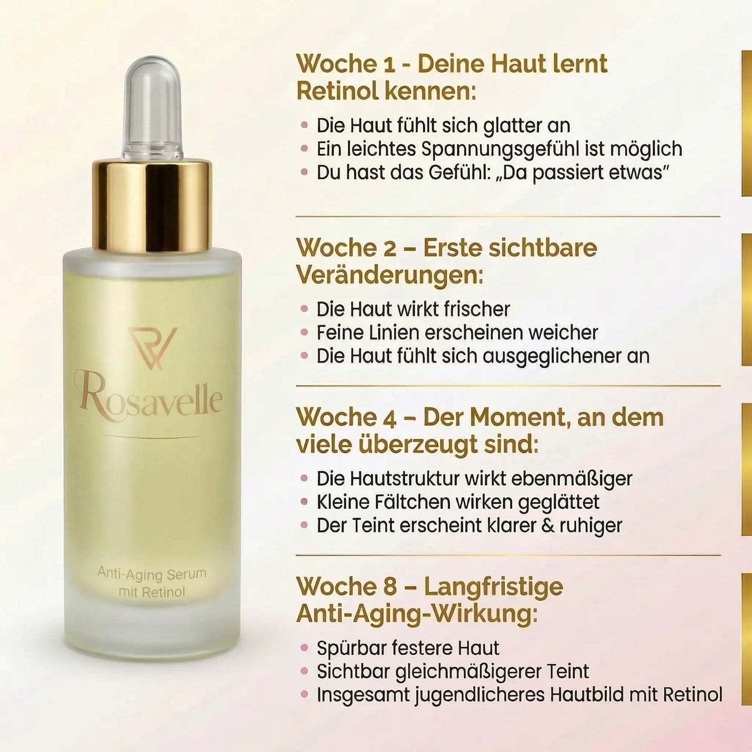 Erste Verbesserungen im Hautgefühl bemerken viele Anwender:innen bereits nach 1–2 Wochen. Sichtbare Anti-Aging-Effekte wie glattere Haut oder weichere Fältchen zeigen sich meist nach 4–8 Wochen regelmäßiger Anwendung.