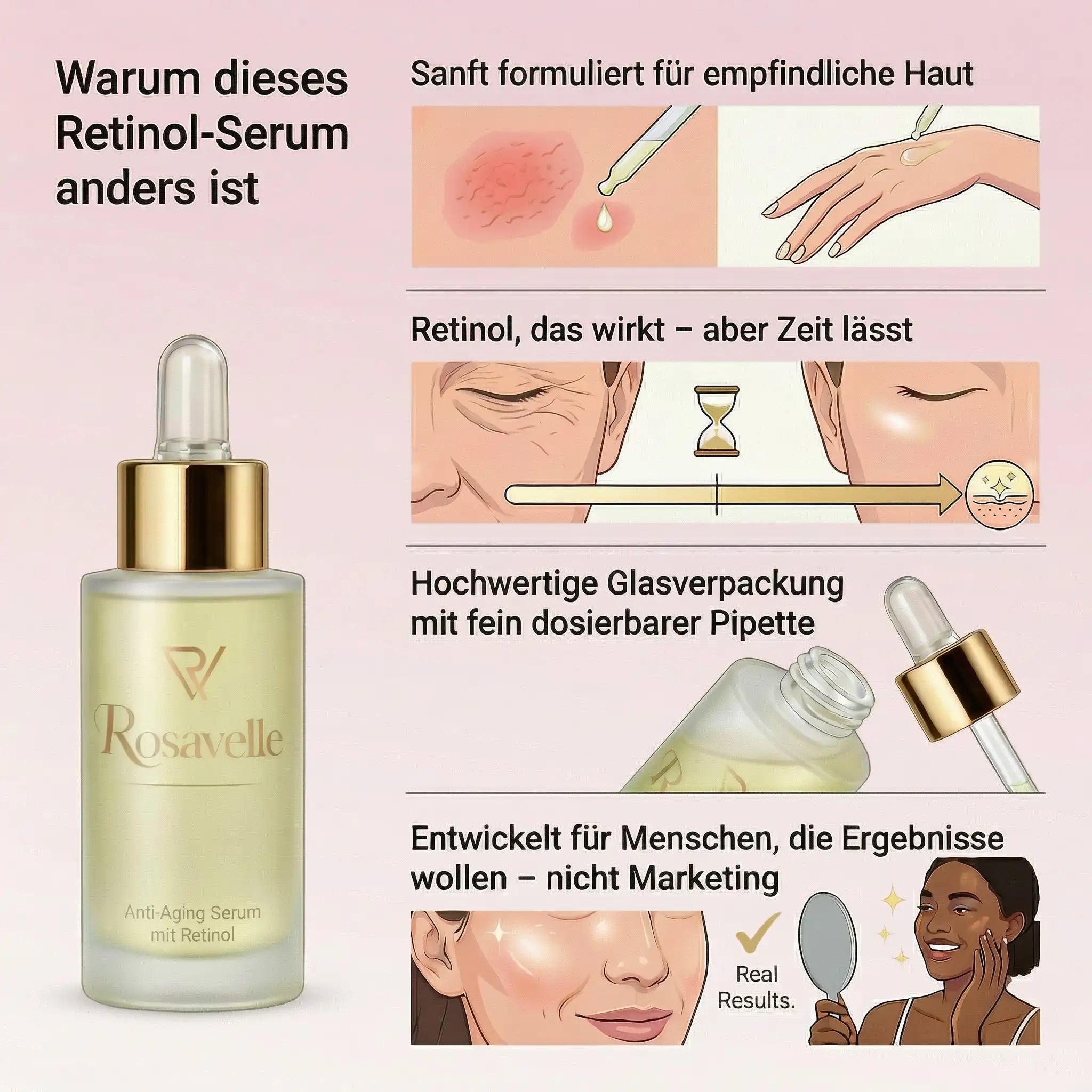 Unser Retinol Serum ist bewusst sanft formuliert. Auch empfindliche Haut kann davon profitieren, wenn das Serum richtig angewendet wird. Wir empfehlen, mit 3-4 Anwendungen pro Woche zu starten und die Häufigkeit langsam zu steigern.